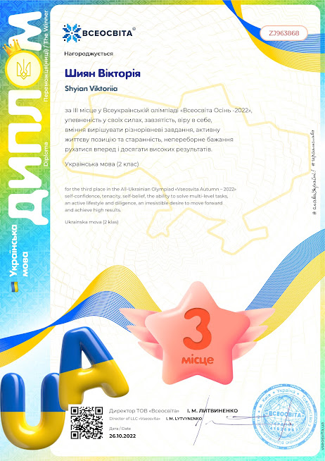 Вітаємо Шиян Вікторію з перемогами та участю в XXІ Всеукраїнській інтернет-олімпіаді «На Урок» з предметів початкової школи!