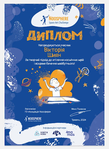Вітаємо активну учасницю всіх конкурсів і олімпіад, ученицю 4 класу, Шиян Вікторію з перемогами у XXIV Всеукраїнській інтернет-олімпіаді "На Урок" з інформатики, математики, української мови, ЯДС, мистецтва та предметів початкової школи Молодець! Так тримати!